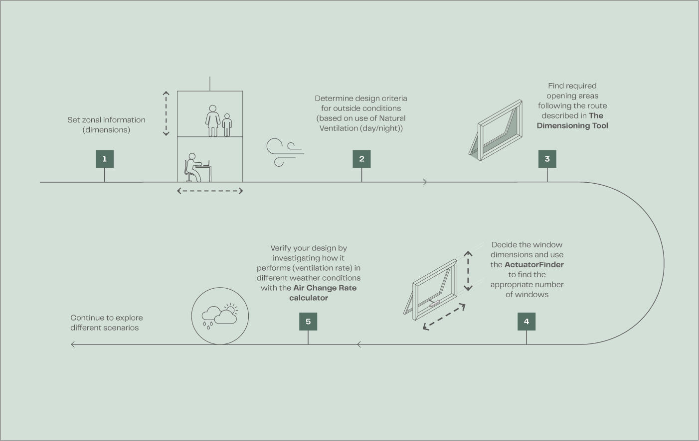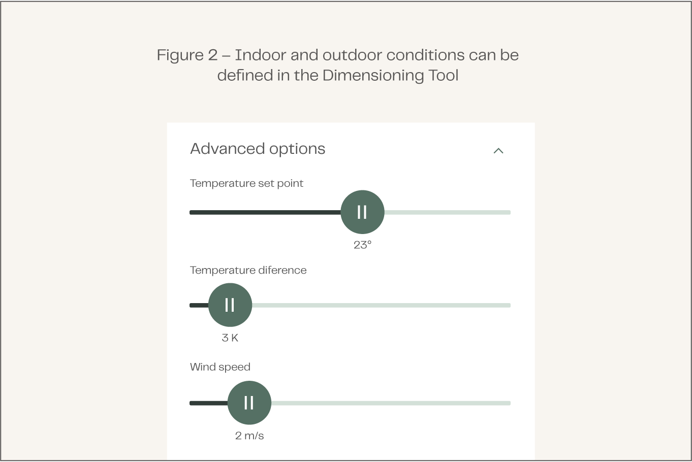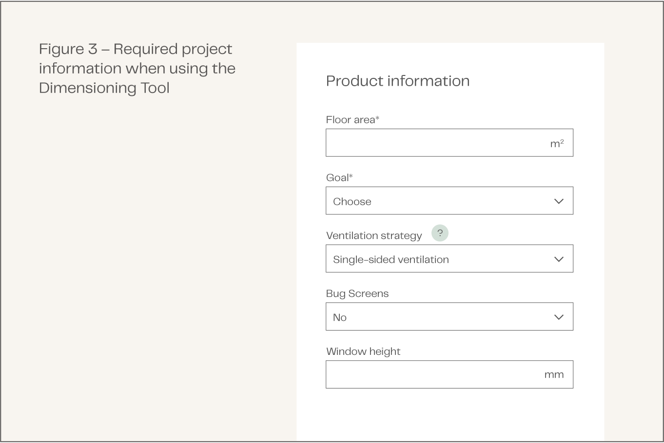 The design criteria for the opening area depend on how many different window configurations are used in the design. If a zone only has one operable window type it is recommended to design the maximum opening area of these based on thermal comfort during the summer. For this it is important to set reasonable expectations for the cooling potential of summer air. Therefore, a good starting point for a design is 20 W/m2. The Dimensioning Tool does not include the effect of night cooling or other cooling features and the cooling demand should therefore be adjusted accordingly. 20 W/m2 is therefore only the cooling effect directly from the supply air.