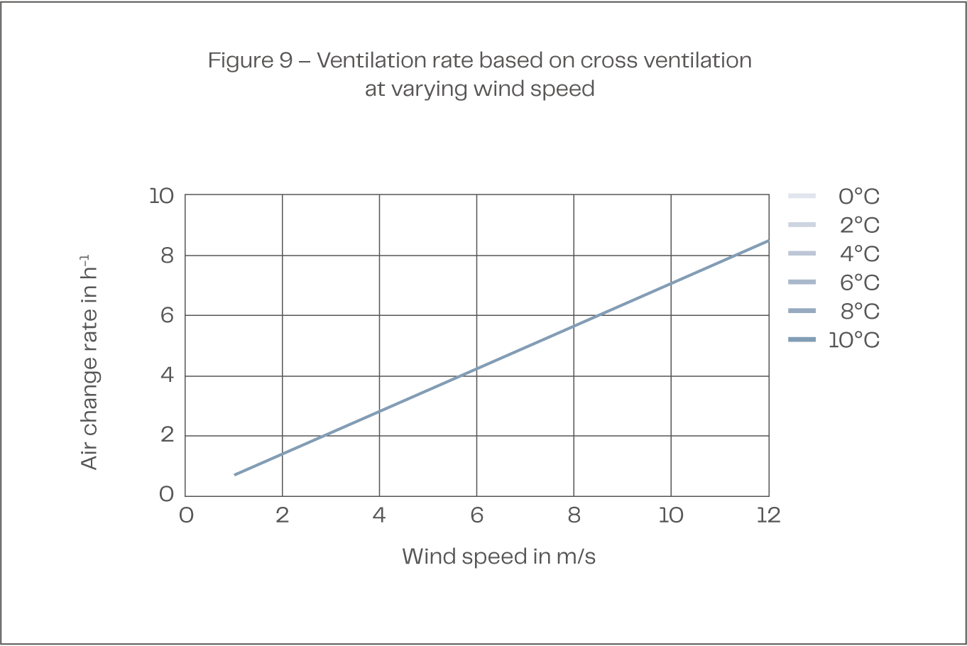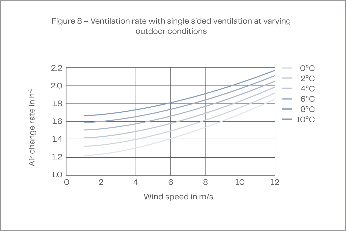 In practice, when the wind speed is very low the ventilation flow can effectively be functions as single sided ventilation, especially when the outdoor temperature is low. Figure 9 shows the air change rate in the room with single sided ventilation. Comparing the performance to the cross ventilation in Figure 9 the air change rate will be higher with single sided ventilation when the temperature difference is approximately larger than 10 °C and the wind speed is below 2 m/s.