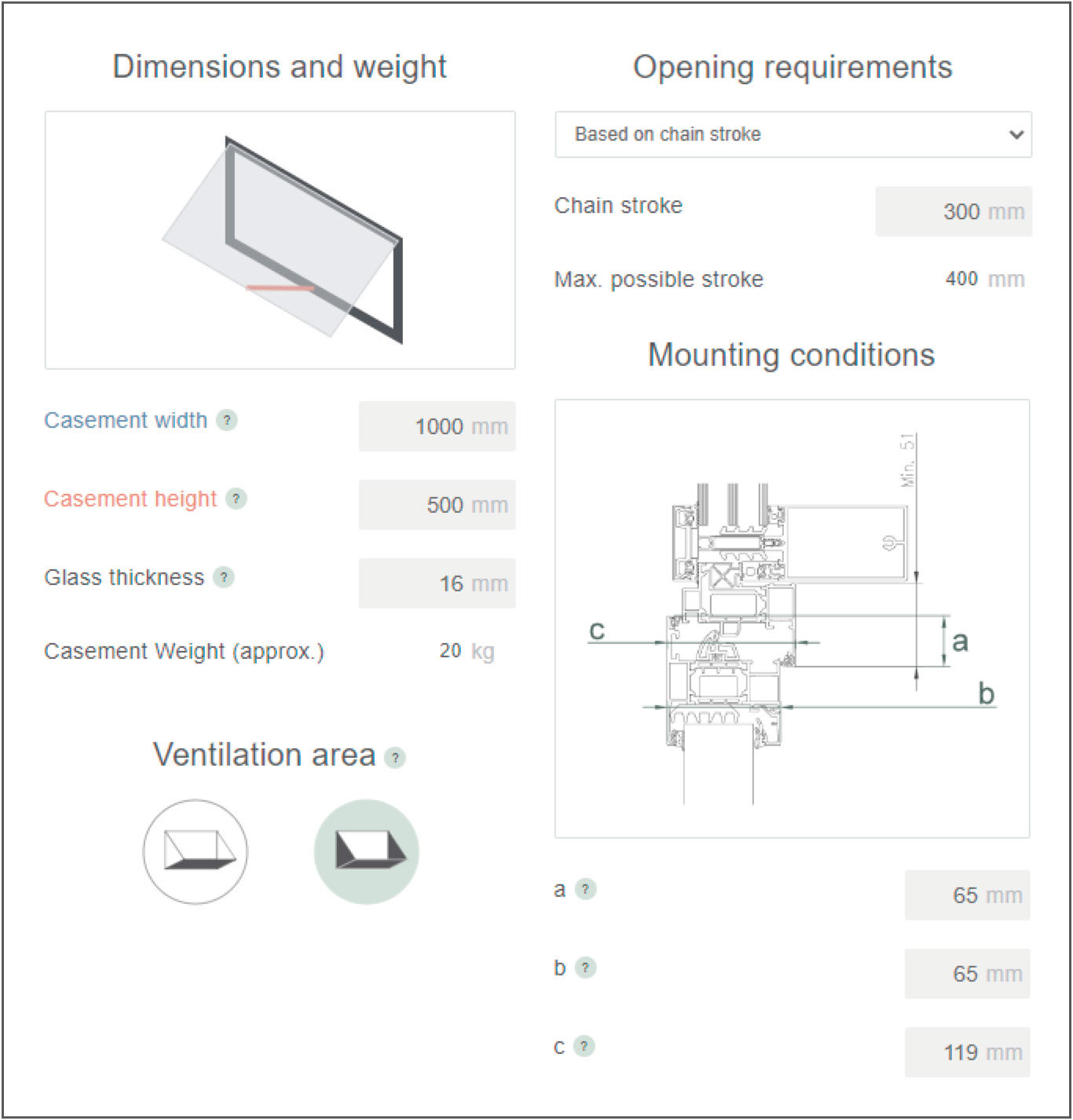 The ActuatorFinder can be used to accurately find the geometric opening area of an operable window based on the window and frame dimensions. One of the most common pitfalls when calculating the opening area of an operable window is to not correctly account for the obstructions of the frame etc. In the ActuatorFinder you can specify detailed information about the window profiles and very accurately calculate the opening area of each window configuration.