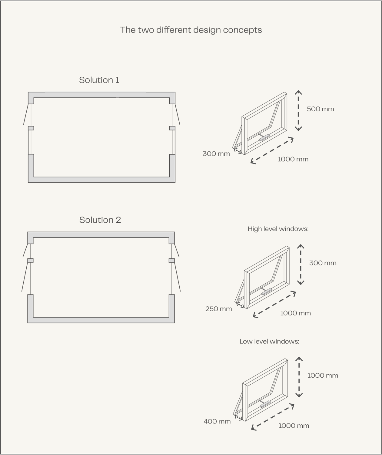 - Solution 2: The smaller high-level windows are designed to achieve 1 L/s/m2 for IAQ. The larger low-level windows are designed to achieve a cooling potential of 20 W/m2 in combination with the smaller windows.