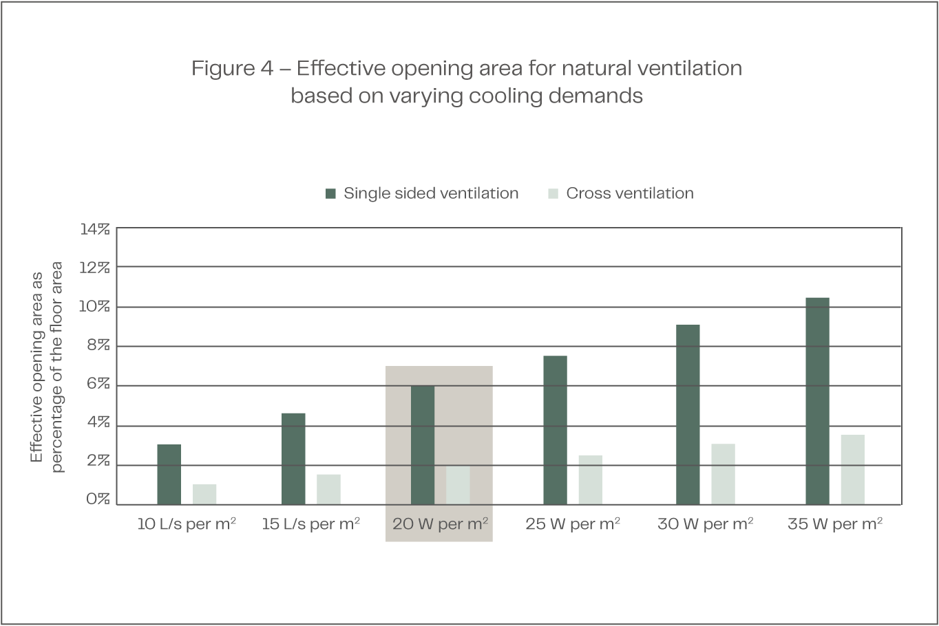 Figure 4 shows the effective opening area as a percentage of the ventilated floor area based on different cooling demands. Based on the outdoor criteria mentioned above, 20 W/m2 can be achieved with an effective opening area corresponding to approximately 2% of the floor area with cross ventilation. If only single-sided ventilation is possible significantly more opening area is needed (about 3 times as much). If this is not possible potential alterations can be made. One is to increase the height of the windows (see info box below for explanation). Another is to place the openings in the façade at different levels to create a stack effect (similar to solution 2). Although not as effective as having roof lights or clerestory windows however it will still have a positive effect.