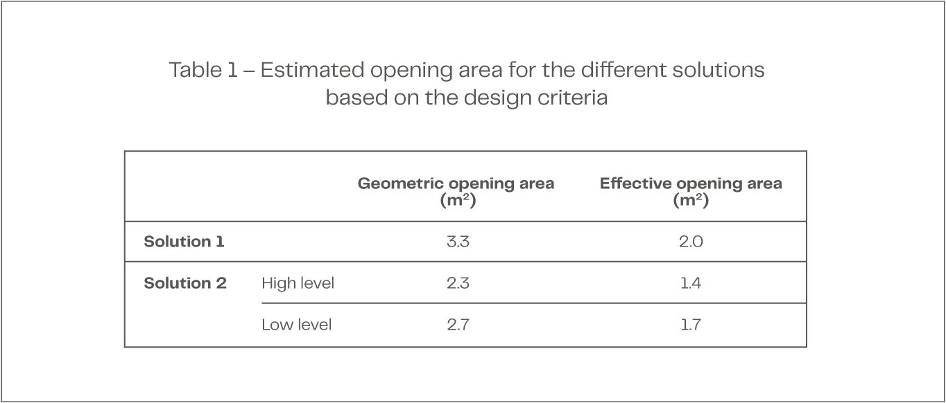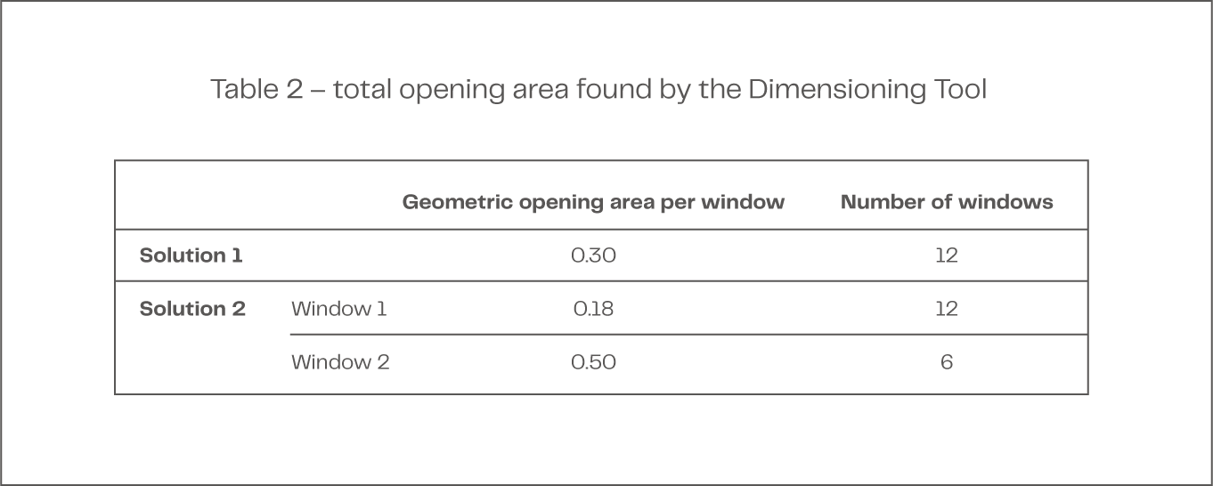 Table 2 shows the number of windows required for solution 1 and 2 to achieve the opening area found by the Dimensioning Tool in the previous section.