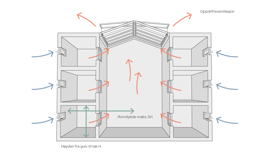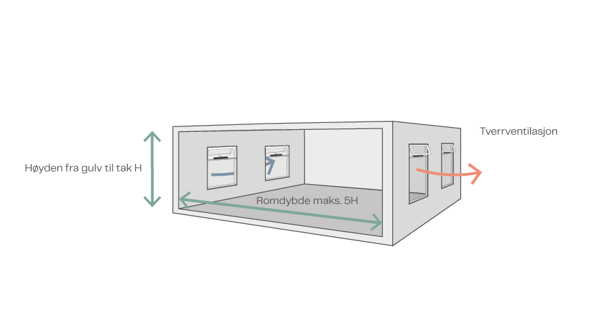 >Når du har fastlagt funksjonen og bruken av de forskjellige rommene, kan du se på designet av rommene basert på romdybde og høyde, da det kan hjelpe deg med å velge en passende strategi for naturlig ventilasjon. I dette avsnittet drøfter vi de tre hovedstrategiene for naturlig ventilasjon og gir tips til når de forskjellige skal velges.