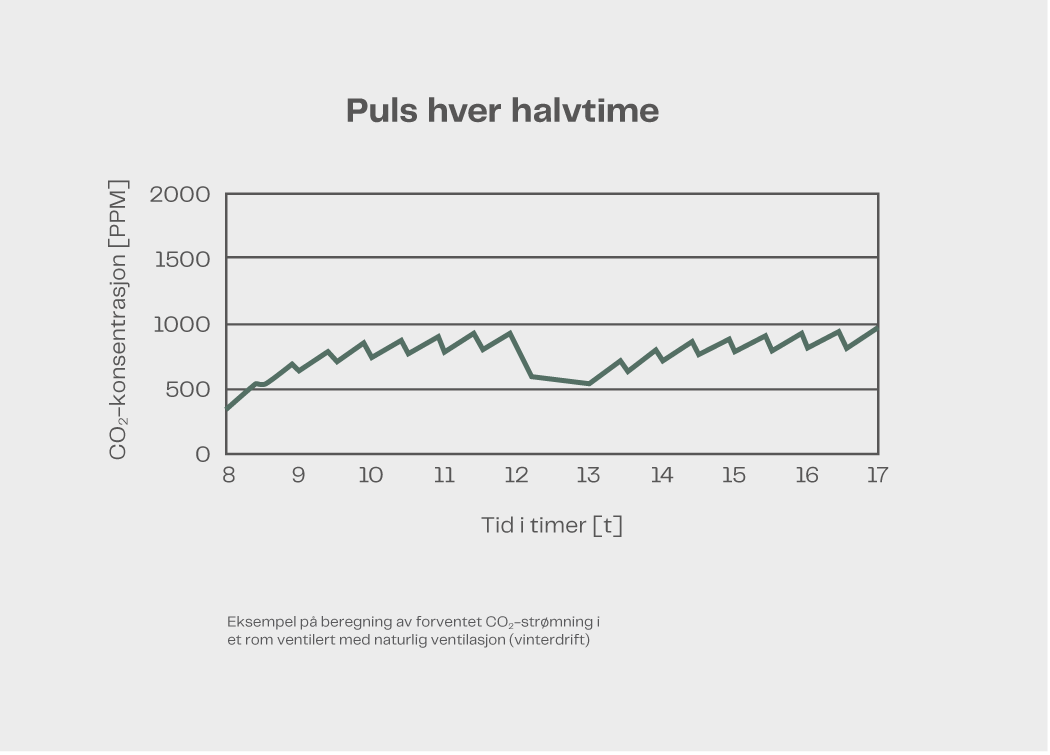 I Danmark har vi f.eks. brukt denne teknikken i en travel kontorbygning der det brukes naturlig ventilasjon hele året rundt. Her har vi en illustrasjon av den beregningen vi laget i designfasen. Kravet om CO2-nivået var maks. 1000 ppm, og med den gitte personbelastningen var det behov for to åpninger (pulser) pr. time.