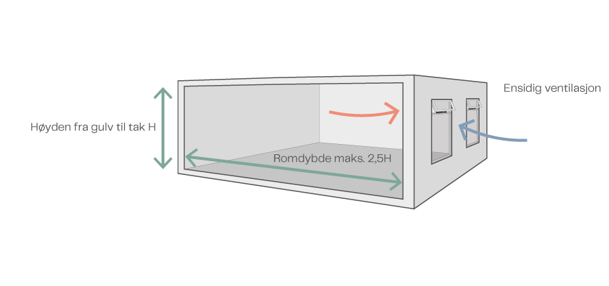 Hvis det området som skal ventileres har en maks. dybde på 2,5 x høyden fra gulv til tak uten å overstige 10 m, kan området ofte ventileres ved hjelp av ensidig ventilasjon.