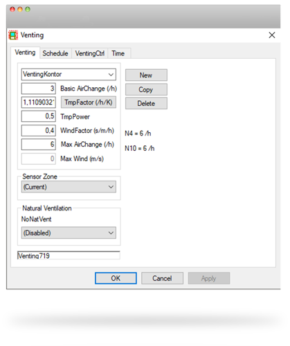 Venting can simulate an air change, which varies with the difference between the temperature indoors and outdoors plus the wind speed. When there is a tendency for the setpoint to be exceeded, the natural ventilation is increased, but only up to a user-defined maximum air change.